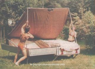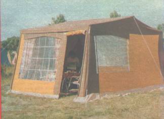 Das Versprechen des Herstellers, der Wohnzeltanhänger sei mit wenigen Handgriffen binnen kürzester Zeit aufgestellt, kann weitgehend eingelöst werden – natürlich nicht beim ersten Aufbau. Die versprochenen 10 Minuten sind aber nicht zu schaffen. Diese Zeit kann man schon zum Ausrichten des Anhängers in die waagerechte benötigen, wenn der Untergrund nicht völlig eben und obendrein locker ist. (Ein Ostseecampingplatz ist etwas anderes, als beispielsweise eine top gepflegte Messehalle). Außerdem vergeht – auch wieder in Abhängigkeit von den Bodenverhältnissen – geraume Zeit für das Verspannen des Zeltes. Unser Testanhänger stand reichlich14 tage an der Ostsee, 100 m vom Strand auf offenem Gelände. Es blieb nicht aus, dass uns unter diesen Bedingungen zeitweise heftiger bis stürmischer Wind um die Ohren blies. Der CT 67-2 hatte seine liebe Not mit ihm. Drückte der Wind auf die Seitenflächen oder schräg von hinten, geriet das gesamte Zelt in ständige Flatterbewegung, peitschten die Zeltwände gegen die schrägen Abspannstangen und die Oberkante des Wagenkörpers. In einer besonders heftigen Gewitterbö verwand sich das Gestänge derart, das wir uns vorsorglich dagegen stemmten. Die Ursache für diese Windempfindlichkeit sehen wir in der Gestängekonstruktion,