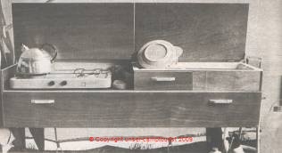 Die Küche erfüllt die Anforderungen, die man an eine Campingküche stellen kann. Besonders angenehm war die eingebaute Spüle. Die Küche ist auf der einen Seite über Scharniere an den Wagenkörper befestigt, auf der anderen wird sie durch Füße abgestützt, die zu montieren sind.
